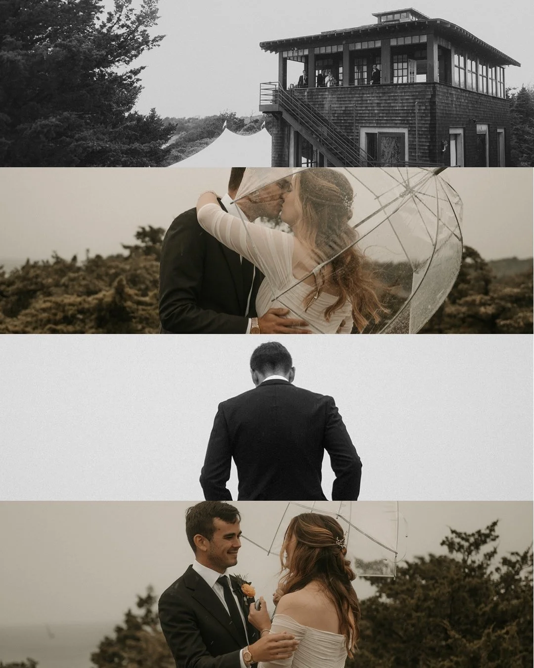 We scout covered locations and bring clear umbrellas. With a first look, we also have more flexibility to dodge showers.